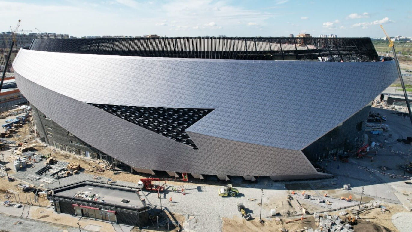 Фасадная система Perfaten АКФ400 с ребрами жесткости, а также с художественной перфорацией, имитирующей «Тень фигуристки»