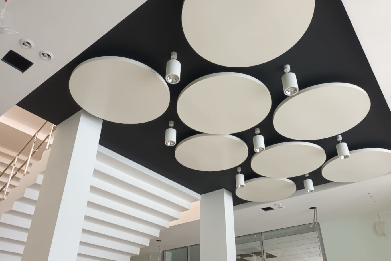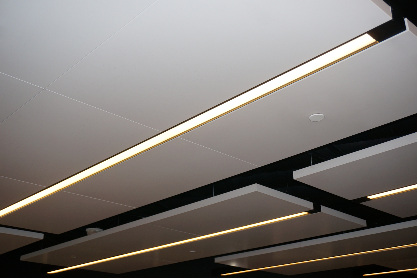 Стеновые панели из алюминиевых листов применяются в офисах для облицовки стен и колонн, создавая индустриальный эффект. Потолочные кассеты усиливают освещение, комбинируясь с подсветкой для динамичной атмосферы.