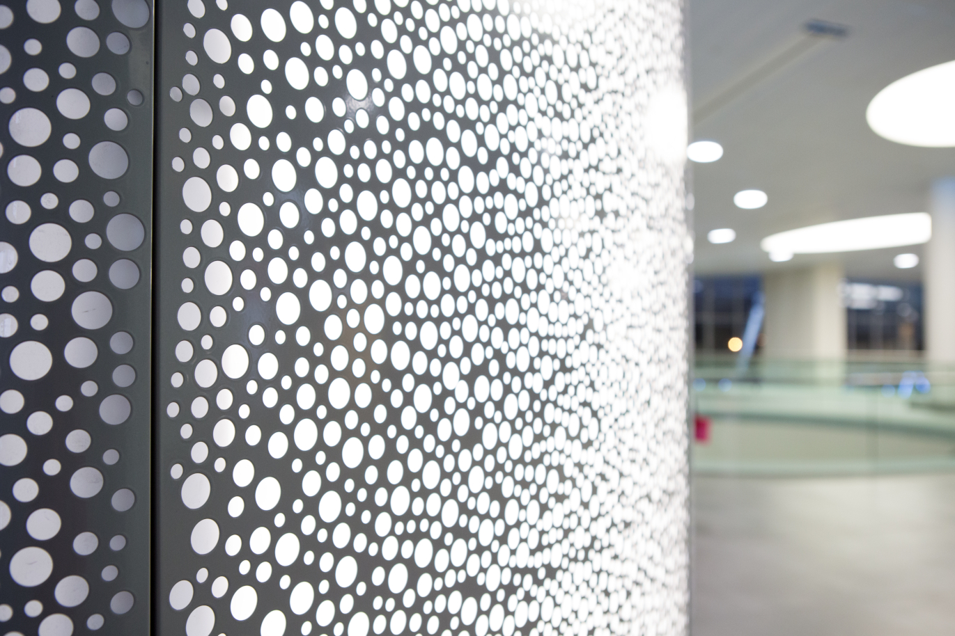 Стеновые панели из алюминиевых листов применяются в офисах для облицовки стен и колонн, создавая индустриальный эффект. Потолочные кассеты усиливают освещение, комбинируясь с подсветкой для динамичной атмосферы.