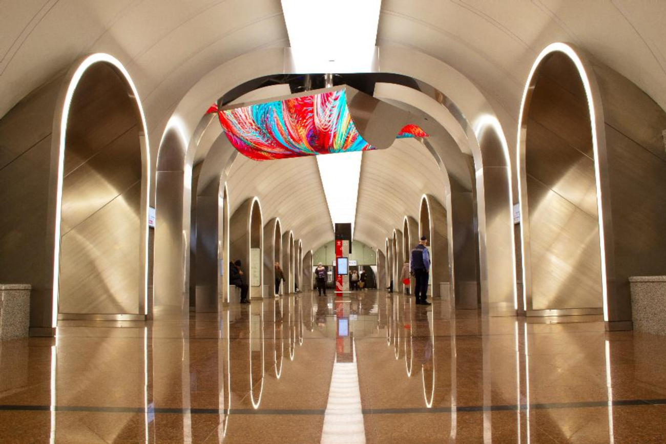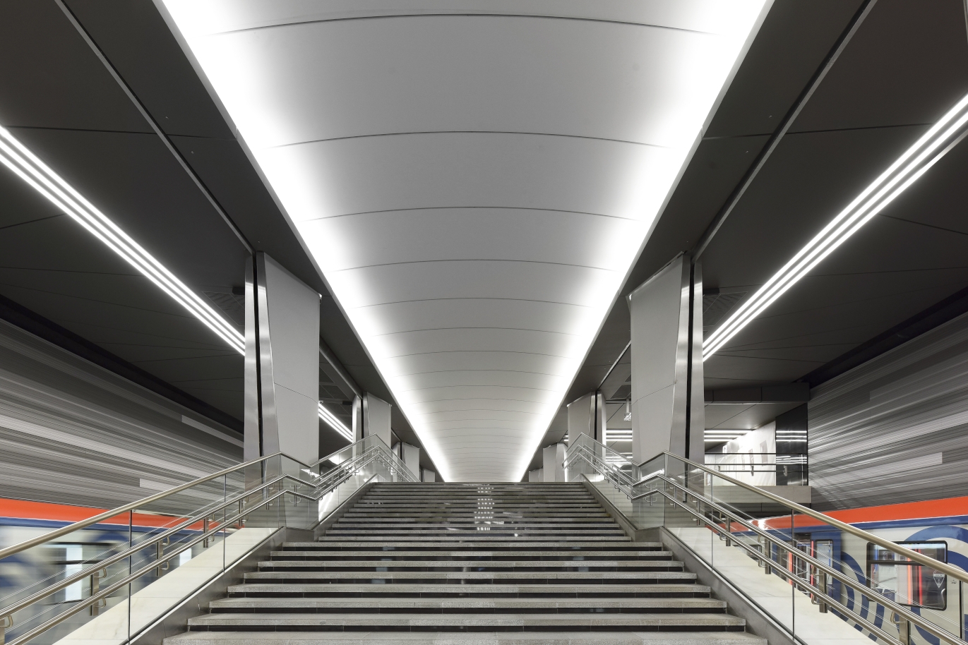 Алюминий активно применяется в отделке интерьеров станций метро. Особенно популярны они в московском метрополитене, где используются с 1970-х годов для облицовки стен, потолков и декоративных элементов. Чаще всего применяют анодированный алюминий и окрашенные сотовые панели из сплавов 5000-й серии (системы «алюминий-магний») для устойчивости к коррозии и нагрузкам. Легкость панелей ускоряет монтаж, снижая нагрузку на конструкции, а стойкость к вибрациям, перепадам температур и абразиву обеспечивает долговечность при огромном потоке пассажиров.